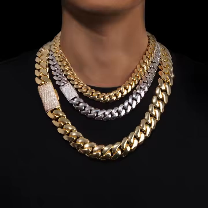 Upgrade your jewelry collection with the 8MM-18MM 925S & VVS Moissanite Box Clasp Stainless Steel Cuban Chain, a bold and luxurious statement piece designed for strength, durability, and unmatched style. Crafted from high-quality stainless steel, this chain is built for long-lasting wear, while the solid 925 silver Moissanite-encrusted lock clasp adds a touch of brilliance and security. Available in Gold and White Gold finishes, this Miami Cuban Link Chain delivers a perfect combination of rugged masculinity and refined elegance, making it a must-have for any collection.